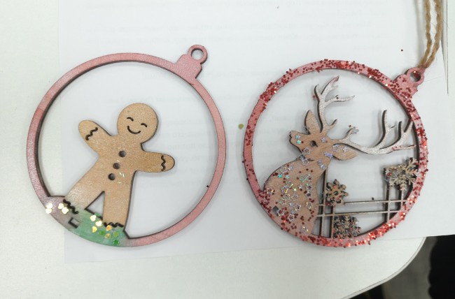 Среди заготовок были фигурки пряничных человечков, оленей, домиков, ажурных снежинок и пушистых ёлочек. В процессе работы участники раскрасили пряничных человечков в коричневый цвет, оленей — в золотой и серебряный, а окна домиков выделили тёплым жёлтым оттенком.
