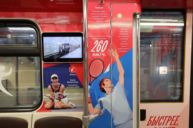 Поезд также содержит познавательные факты о спорте. Пассажиры смогут узнать, зачем замораживают шайбу перед хоккейным матчем, какова средняя скорость горнолыжника на спуске и сколько веса теряют керлингисты во время состязаний.
