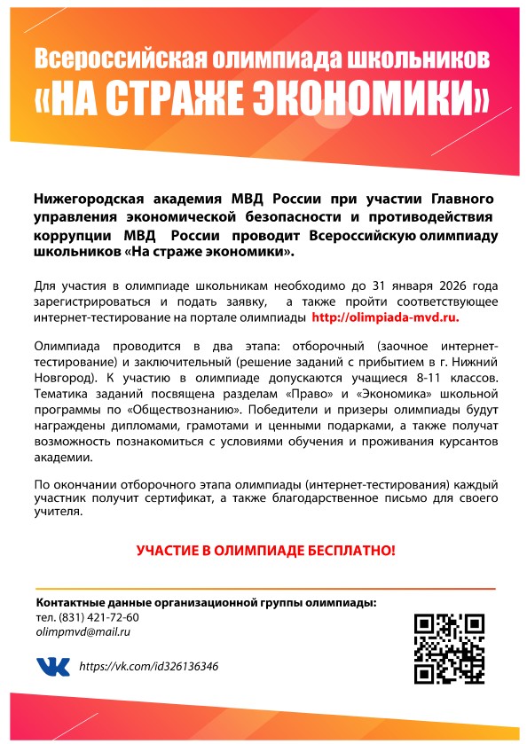 В целях ранней профессиональной ориентации граждан на службу в органы внутренних дел и отбора потенциальных кандидатов на обучение в образовательные организации системы МВД России, ФГКОУ ВО «Нижегородская академия МВД России» организует проведение Всероссийской олимпиады школьников «На страже экономики».